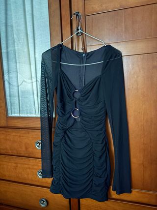 Vestido elegante de manga larga con detalles de transparencias y fruncidos. - Diseño con escote cuadrado. - Aros metálicos decorativos en el escote y cintura. - Mangas largas de tejido de malla. - Falda fruncida con efecto drapeado.