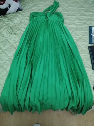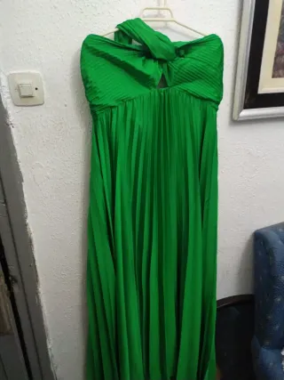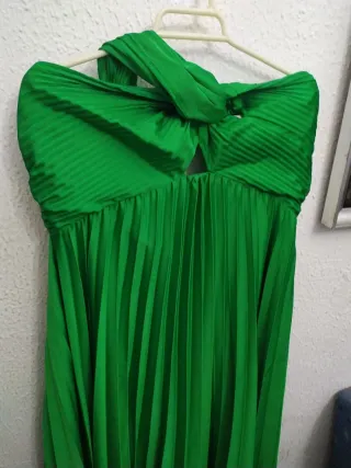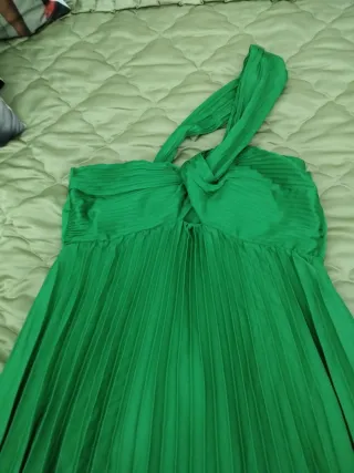Elegante vestido de fiesta largo con un diseño plisado que le da mucho movimiento. Perfecto para eventos especiales. - Escote halter anudado. - Falda larga con plisado. - Tejido ligero y fluido.