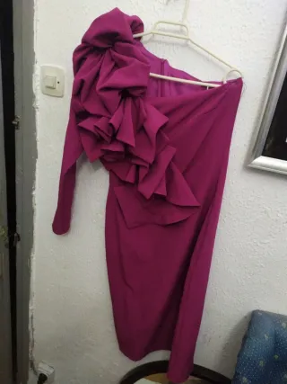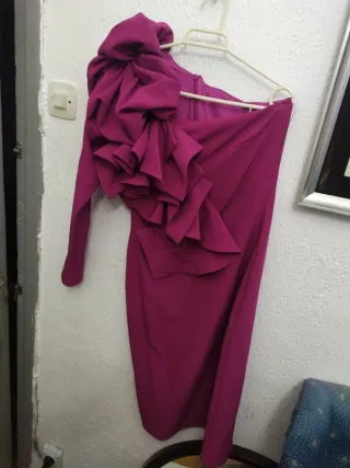 Elegante vestido de fiesta con un diseño llamativo. - Escote asimétrico. - Detalle de volantes en el hombro y el torso. - Manga larga en un lado. - Corte ceñido a la figura.
