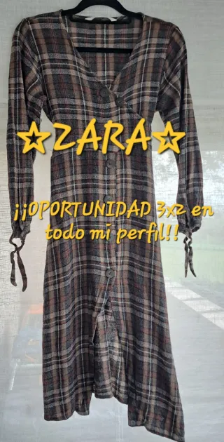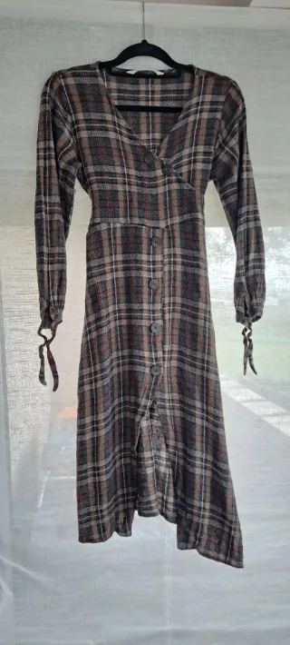 Vestido largo de Zara con estampado de cuadros. - Diseño cruzado con botones. - Mangas largas con detalle de lazada en los puños. - Largo midi.