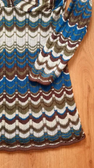 Vestido de punto con un llamativo estampado de zigzag en tonos azules, marrones y crudos. Diseño con escote en V. - Manga larga. - Tejido ligero y calado.