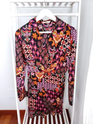 Vestido camisero largo con un vibrante estampado. - Diseño camisero con cuello y bonitos botones de nácar (+1 de repuesto). - Mangas largas con puños que se pueden recoger para dar un aire más informal. - Estampado paisley y floral. - Con bolsillos ocultos laterales. - Hombros 40, axilas 52, cintura 46, largo 135. - 100% viscosa. - Está como nuevo. Hago envíos.
