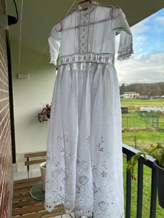 Vestido de cristianar de tela fina y delicada, ideal para ceremonias especiales. - Diseño clásico con detalles de encaje. - Mangas largas. - Cuello alto con puntilla.
