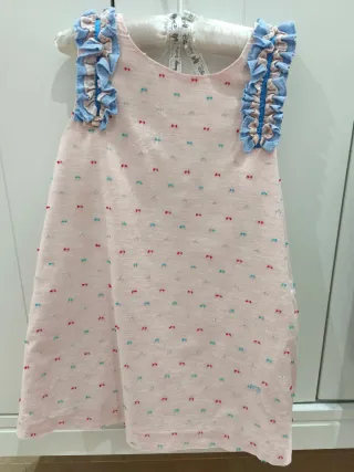 Vestido de algodón para niña, perfecto para el verano. Presenta un estampado de pequeños detalles. - Tirantes con volantes. - Lazo decorativo en la parte trasera. - Tejido ligero y transpirable. Medidas: Ancho de sisa a sisa 30 cm Largo 49 cm