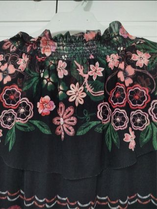 Precioso vestido largo, ideal para verano. Está en muy buen estado. - Escote hombros caídos. - Diseño floral multicolor sobre fondo negro. - Tejido ligero y fluido.