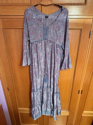 Vestido largo de estilo boho, comprado en comercio local. Confeccionado en tejido ligero y fluido, muy cómodo y favorecedor. Estampado en tonos malva, azul y gris, con escote en pico y detalle de cordón con borlas. Manga larga ligeramente acampanada y corte bajo el pecho con caída amplia, ideal para diferentes tipos de cuerpo. Talla única En muy buen estado, apenas usado. Ideal para entretiempo, eventos informales o looks diarios con botas o sandalias