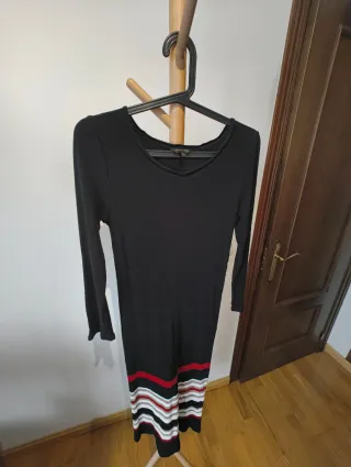 Vestido de punto de manga larga con un diseño elegante y moderno. - Cuello en pico. - Bajo con detalle de rayas multicolor. - Talla M Nota: En buen estado, ha estado guardado. Hago envío nacional e internacional y si eres de la zona de Segovia capital / La Lastrilla te lo entrego en persona !