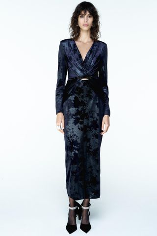 Vestido midi de terciopelo con un diseño elegante y moderno. Precio negociable. - Tejido de terciopelo con textura. - Detalle de anilla dorada en la cintura. - Mangas largas. - Corte cruzado.