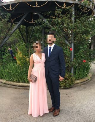Elegante vestido largo para ceremonias, diseñado especialmente para futuras mamás. Su diseño favorecedor se adapta a la silueta. - Corte imperio. - Escote halter. - Tejido vaporoso. Puesto una sola vez, me quedaban 5 para dar a luz