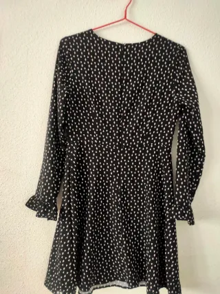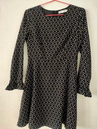 Vestido negro con estampado de rombos pequeños en blanco y rosa pálido. Tiene mangas largas y un corte favorecedor.Made in Spain. - Estampado de rombos. - Mangas largas con volantes en los puños. - Cierre de cremallera en la espalda.