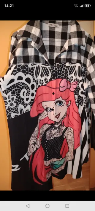 Vestido camisero de manga larga con un diseño llamativo y original. - Estampado de cuadros en blanco y negro en la parte superior. - Diseño de personaje animado con tatuajes en la parte frontal. - Detalle de encaje y patrones geométricos en blanco y negro. - Corte holgado y cómodo.