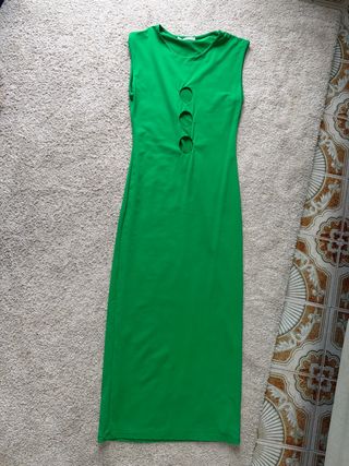 Vestido largo de corte ajustado en un llamativo color verde. Presenta un diseño moderno con tres aberturas circulares en la zona del torso. - Diseño sin mangas. - Largo hasta los tobillos. - Corte ceñido al cuerpo.