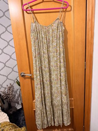 Vestido largo con estampado floral y tirantes finos. Temporada pasada Nuevo sin ningún uso - Diseño con volantes en el bajo. - Tejido ligero y fluido.