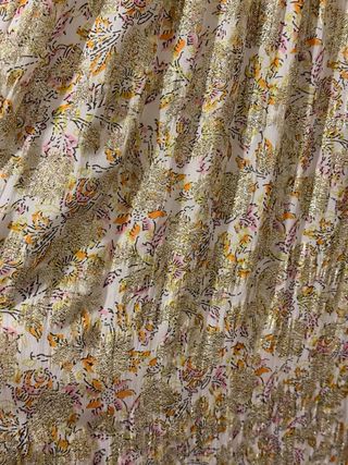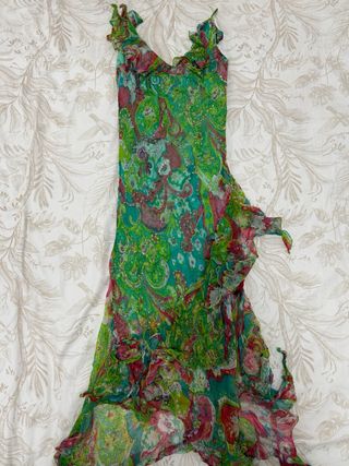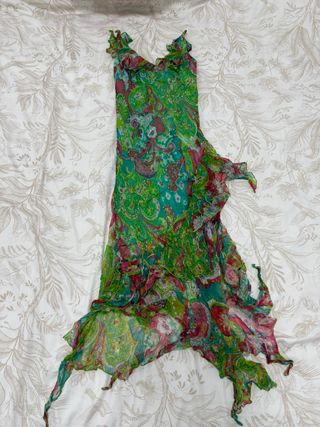 Vestido de fiesta con un diseño vibrante y detalles delicados. - Tejido ligero y vaporoso. - Estampado paisley con toques brillantes. - Volantes en tirantes y bajo. - Corte asimétrico. Talla 40 pero es ajustada
