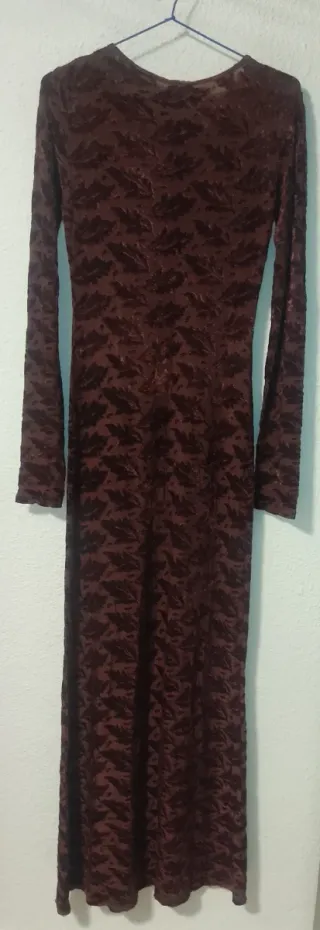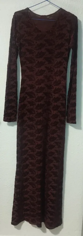 Vestido de terciopelo devoré (también conocido como terciopelo burnout) con un diseño botánico o de hojas en un tono burdeos o rojo vino. - Tejido elástico. - Diseño ajustado. - Usado una vez. - Largo 1,60cm manga 70 cm.