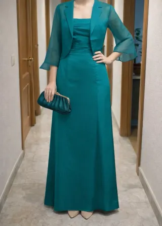 Vestido largo en raso brillante verde, elegante y muy especial. Incluye chaquetita a juego de gasa Lleva forro interior blanco y tela interior para sacar, se puede ajustar por modista. 📏🧵 Medidas (cm): • Sisa a sisa: 37 • Largo: 125 Bolso clutch , en tono verde satinado 📏🧵 Medidas (cm): • Ancho: 20 • Alto: 12