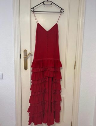 URGE VENDER Vestido largo de color rojo con múltiples volantes. - Diseño con tirantes finos. - Detalle de botones en la parte frontal. - Adorno de encaje en la cintura. - Falda con volantes escalonados.