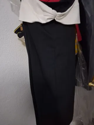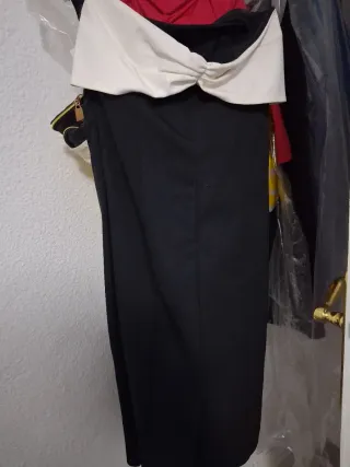 Elegante vestido con un diseño moderno. - Cuerpo superior en blanco con detalle de nudo. - Falda larga en negro. - Cremallera lateral .