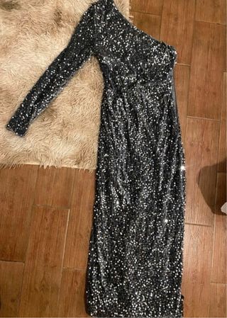 Elegante vestido largo con lentejuelas plateadas y diseño de un solo hombro. Perfecto para eventos especiales. - Diseño de un solo hombro. - Manga larga. - Largo hasta el suelo. - Cubierto de lentejuelas brillantes.