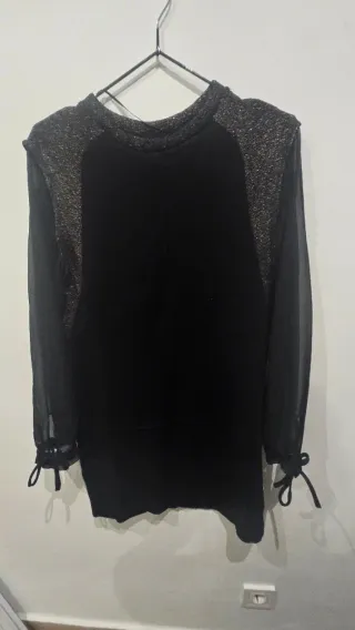 Vestido elegante de color negro con un diseño moderno. - Mangas largas de tul con detalle de lazo en los puños. - Hombros con tejido brillante. - Corte recto.