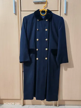 Elegante abrigo largo para niña, perfecto para ocasiones especiales. - Diseño de doble botonadura con botones dorados. - Cuello y bolsillos con detalle de terciopelo. - Color azul marino.