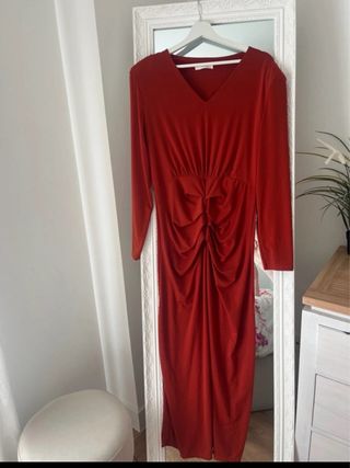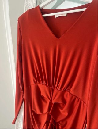 Elegante vestido de corte midi en color terracota, ideal para eventos. Un solo uso para una boda. - Diseño con escote en pico. - Detalle fruncido en la cintura. - Manga larga. - Tejido fluido. - Apertura frontal