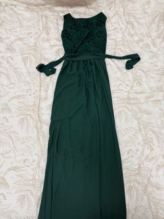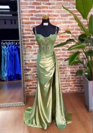 Elegante vestido largo de color verde, ideal para eventos especiales. Presenta un diseño con corpiño de encaje y falda satinada con abertura. Me cosro 200 dolares con el envio es de estados unids usado unasola vez en la foto aparece su precio sin envio La tienda se llama stacees para que puedan verlo - Corpiño con detalles de encaje y pedrería. - Falda larga satinada con drapeado. - Abertura lateral pronunciada. - Tirantes finos.