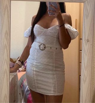 Vestido blanco con detalle de encaje y mangas abullonadas. - Diseño escotado. - Cinturón a juego con hebilla. - Largo mini.