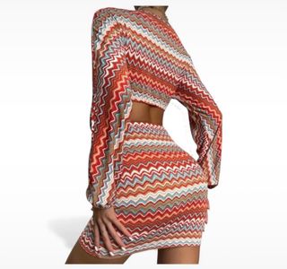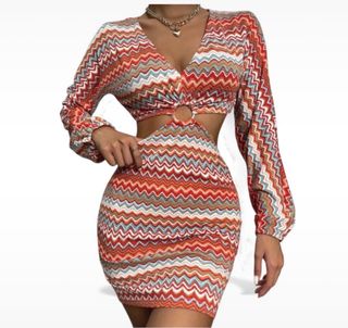 Vestido con un llamativo estampado de zigzag. - Diseño con escote pronunciado. - Corte cut-out en la cintura. - Mangas largas. - Detalle de aro metálico en el escote.