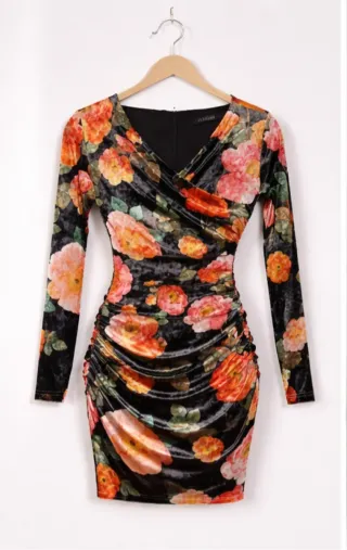 Vestido de terciopelo con estampado floral y detalle fruncido. - Manga larga. - Escote en V. - Largo mini.