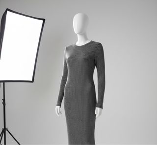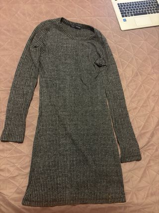 Vestido de punto de manga larga con un diseño acanalado que se ajusta a la silueta. - Cuello redondo. - Largo hasta la rodilla. - Pequeño logo en el pecho. This dress is incredibly feminine – it fits perfectly and beautifully accentuates the figure. The classic gray color with a subtle stripe makes it a timeless wardrobe staple that pairs well with both sneakers and elegant ankle boots. Condition: The dress is like new, with no signs of wear, holes, or snags.