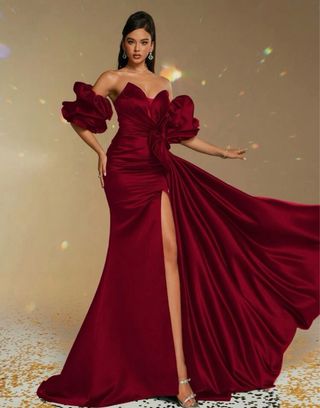 Elegante vestido de fiesta largo con un diseño llamativo. - Escote corazón. - Mangas abullonadas. - Abertura lateral. - Detalle drapeado en la cintura. - Tejido satinado.