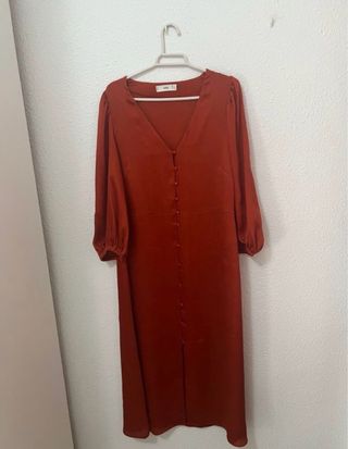 Vestido midi de Mango con un diseño elegante y favorecedor. Color ladrillo - Escote en pico. - Cierre de botones en la parte delantera. - Mangas largas abullonadas. - Largo midi. Mas vestidos de este estilo en mi perfil Se realizan lotes ropa con descuento