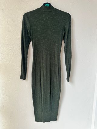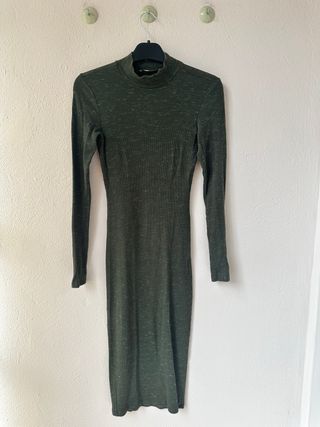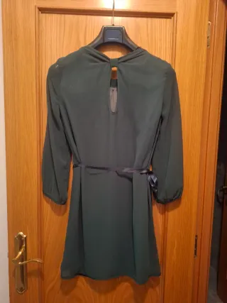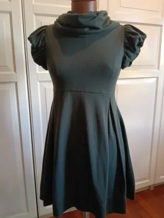 Vestido corto de manga abullonada y cuello tortuga. Solo se ha puesto una vez. - Color verde militar. - Manga corta abullonada. - Cuello tipo bufanda. - Largo mini.