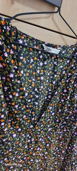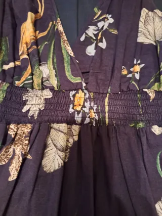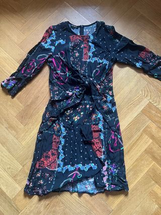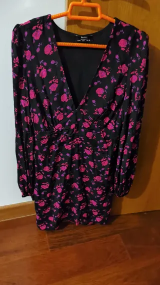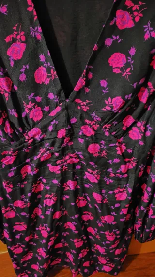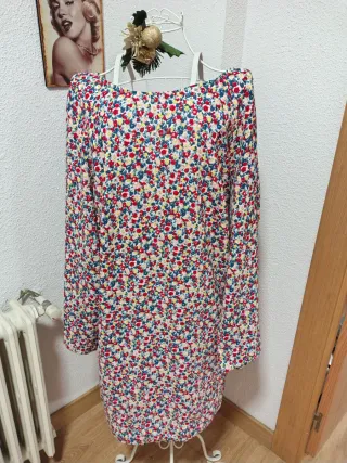 Vestido de Zara cuello V con un bonito estampado floral. Pone en la etiqueta XL pero en realidad sería como una L. Medidas: Ancho cintura 44 cm. Largo manga 60 cm. Largo vestido 81 cm. Profundidad del cuello pico 30 cm.