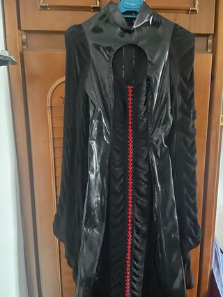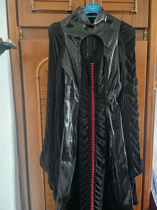 Vestido largo de estilo gótico de la marca Phaze. Presenta un diseño llamativo con detalles en rojo. - Diseño largo. - Detalle de cordones rojos. - Escote con abertura. - Mangas acampanadas.
