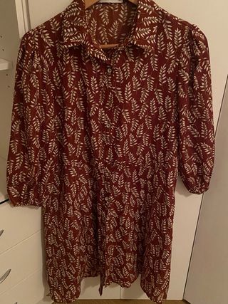 Vestido con un bonito estampado de hojas en tono marrón. Ideal para un look casual. - Diseño con cuello camisero. - Cierre de botones en la parte delantera. - Mangas largas abullonadas. - Largo midi.