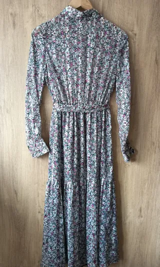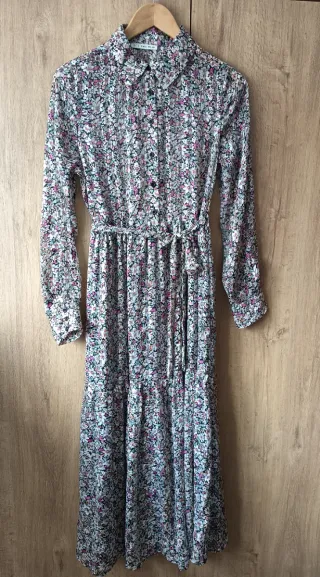 Vestido largo con estampado floral, ideal para un look casual y cómodo.Tela con caída. - Diseño de manga larga. - Cinturón a juego para ajustar la silueta. - Cuello camisero. - Cierre de botones en la parte delantera.