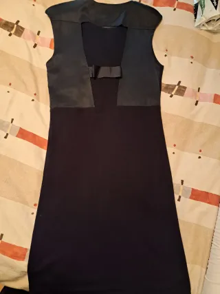 Vestido elegante de la marca Caramelo. - Diseño sin mangas con hombreras - Corte recto. - espalda al aire con lazo negro. - largo por debajo d la rodilla