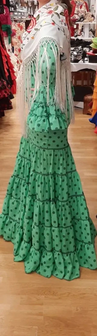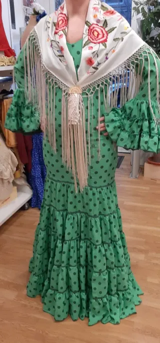 Vestido de flamenca con un diseño vibrante y alegre. - Color verde con lunares verde oscuro. - Mangas acampanadas con volantes. - Falda larga con múltiples volantes. - Incluye mantón bordado con flores y flecos.