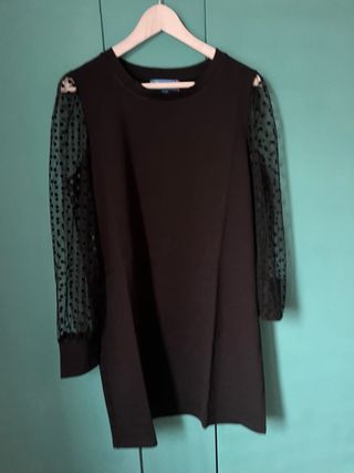 Elegante vestido negro con un diseño moderno y detalles únicos. - Mangas largas de tul con estampado de lunares. - Cuello redondo. - Corte recto.