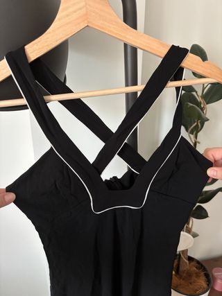 Elegante vestido negro de Max Mara con un diseño cruzado en la parte superior y ribete blanco. - Tirantes cruzados. - Ribete blanco. - Cremallera en la espalda. - Largo midi