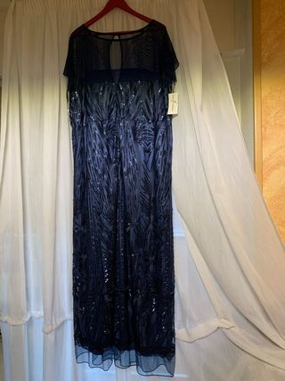 Elegante vestido de ceremonia o fiesta, ideal para eventos especiales. Nuevo y CON ETIQUETA. Se ve en una de las fotos como es la manga y en otra una pinza muy discreta y linda en la parte de atrás. - Diseño largo con lentejuelas. - Escote con detalle de transparencia. - Mangas cortas tipo capa. (Talla Grande)