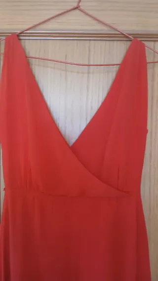 Elegante vestido largo de color rojo. - Diseño con escote en V. - Corte cruzado en la parte delantera. - Tejido ligero y fluido.