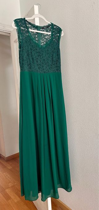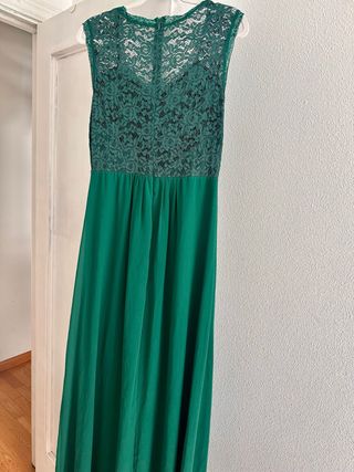 Elegante vestido largo para bodas o eventos especiales. Confeccionado con un delicado encaje en la parte superior y una falda fluida. - Diseño de corte imperio. - Escote redondo con detalle de encaje. - Espalda con cierre de cremallera. - Falda larga y vaporosa. - Verde botella - No se arruga