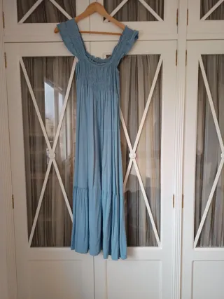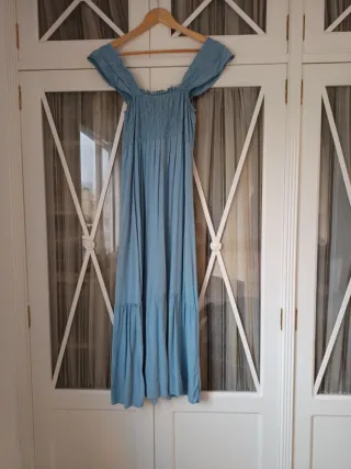 Vestido largo con tirantes y escote elástico. -Puede valer para 38-40 de talla - Diseño con fruncido en el pecho. - Falda con volantes. - Tejido ligero y fluido.
