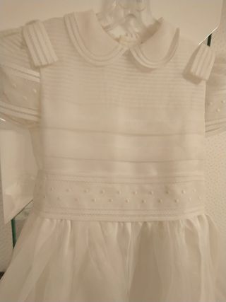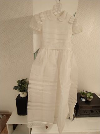 Vestido clásico para comunión de niña. Un diseño elegante y atemporal. - Manga corta abullonada. - Cuello Peter Pan. - Tejido con detalles de rayas y puntitos. - Falda vaporosa. - Medidas 70 cm de pecho / 64 cm cintura / 116 cm largo