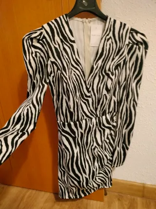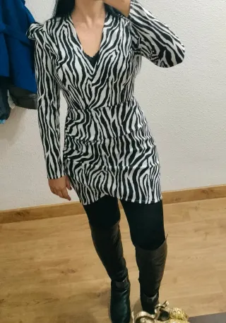 Vestido precioso elástico sin estrenar con su etiqueta de cebra de pura vida clothes. Es ideal y muy estiloso. Es talla s y yo llevo una 38 me queda algo justo como se ve en la foto, por lo que para que quede más suelto lo ideal es para una s o para llevarlo como me queda a mí. Me costó 70 eur para un evento que al final no lo utilice con estampado de cebra. - Diseño de manga larga. - Cuello en V. - Corte ajustado.