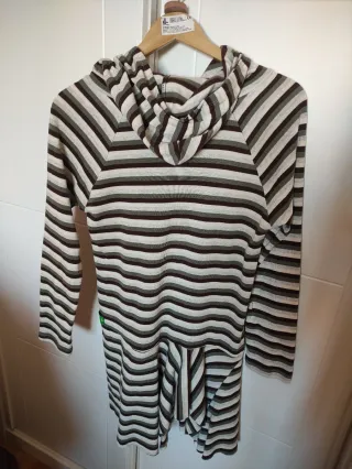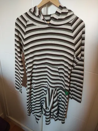 Vestido de estilo hippie con un diseño de rayas en varios tonos. Ideal para un look casual y cómodo. - Diseño de rayas horizontales. - Manga larga. - Capucha. - Bolsillo delantero tipo canguro. - Falda desigual