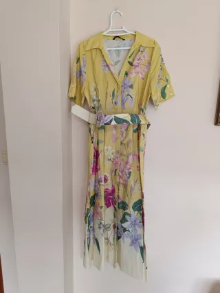 Vestido midi con estampado floral vibrante sobre fondo amarillo. Presenta un diseño camisero con cuello y manga corta, cinturón a juego y falda con vuelo. Vestido con cuello de solapa, escote en V y manga corta. Cinturón a juego. Cierre frontal con botones. Multicolor. - Estampado floral multicolor. - Cinturón blanco con hebilla. - Largo midi. Zara Talla M